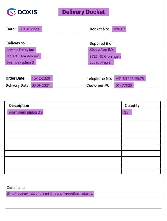 Un comprobante de entrega puede tener un aspecto muy diferente de otro. Hay muchos formatos y plantillas en el mundo. En general, procesamos todos estos tipos porque Doxis no se basa en plantillas, sino en el aprendizaje profundo.