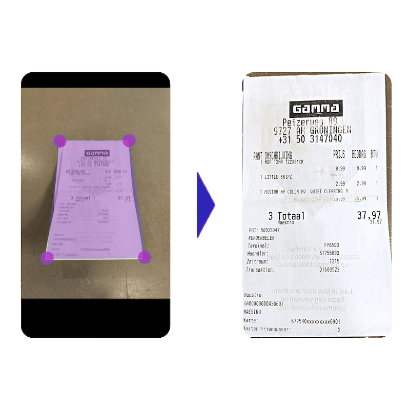 Une image vaux mille mots. Vous trouverez ci-dessous un exemple des étapes suivies par notre SDK mobile pour extraire automatiquement les données des documents.
